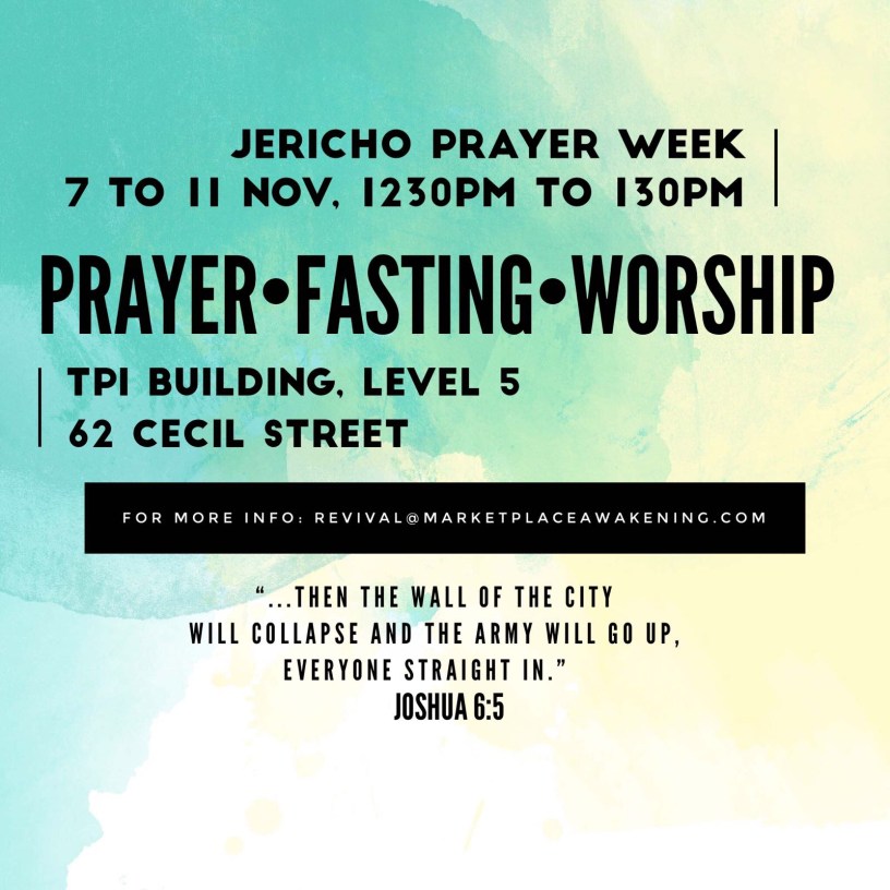 Our second and final prayer set for the year happens from 7 to 11 November from 1230pm to 130pm. The venue is TPI building level 4, 62 Cecil Street. Nearest MRT is Telok Ayer MRT Station.