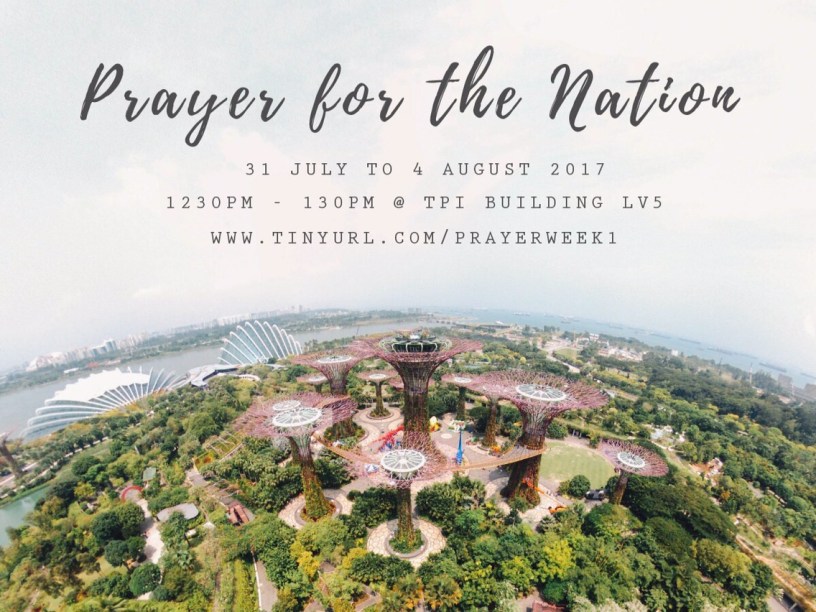 Join us for this week of prayer and worship in the marketplace as we join with the whole nation in a season of prayer leading up to National Day. We will meet daily from 31 July to 4 August, 1230pm to 130pm, at TPI building level 5. For more details click here.