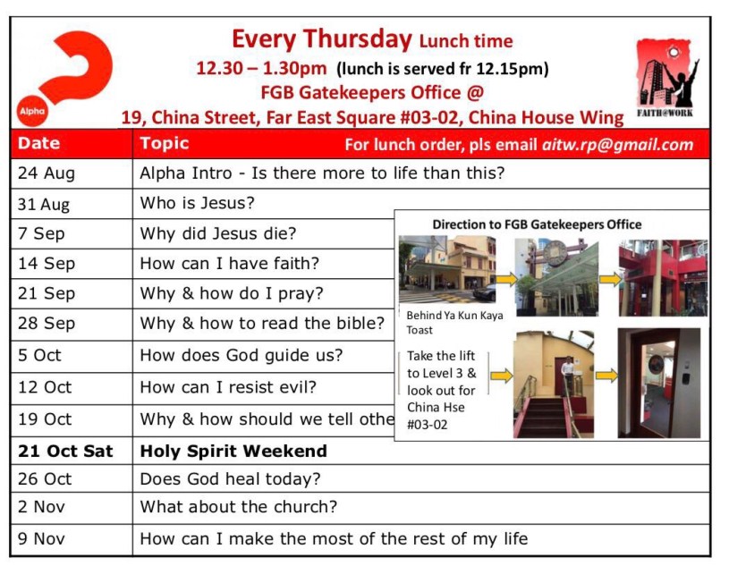 Join Faith@Work for this series happening during lunch time starting 24 August! For registration or more details please email: Aitw.rp@gmail.com